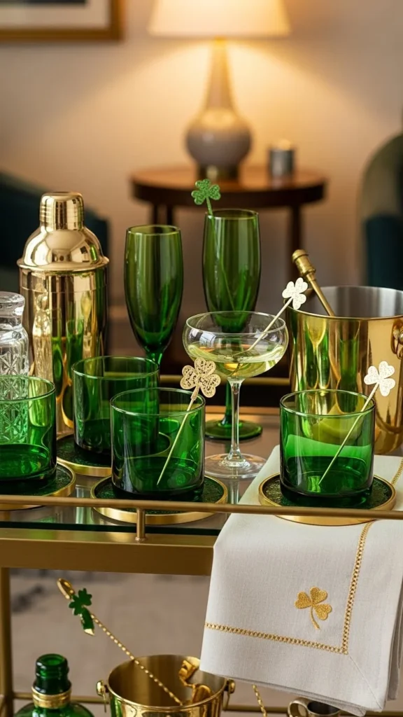 Bar carts are made for themed moments. Use green glassware and simple decor. Keep bottles organized. Less styling keeps it usable for guests.
