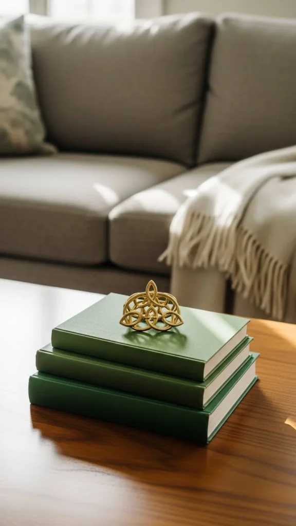 Books make great decor when chosen thoughtfully. Stack two or three green-toned covers for a seasonal nod that feels grown-up. Hardcovers work best for clean lines. Height variation keeps it interesting. Add a small object like a brass bowl or candle on top. Keep the stack off-center so the table stays usable. Thrift stores are perfect for finding color-based books at low cost. This idea works in living rooms, bedrooms, or offices. When the season ends, rotate the books back into shelves or switch the top object for a neutral look.