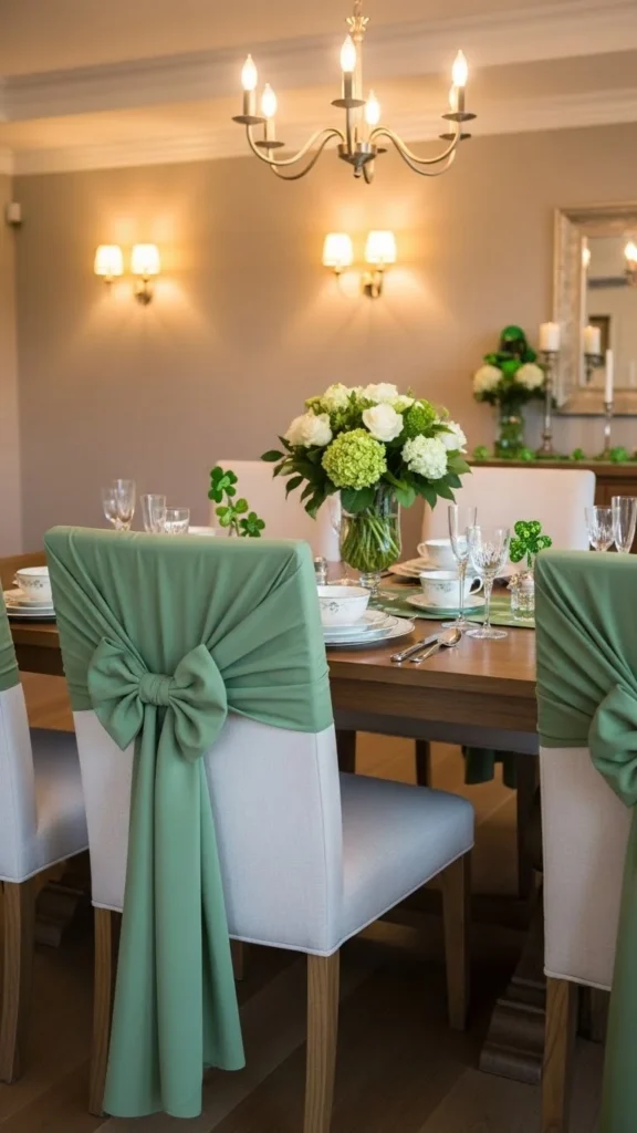 Chair sashes add movement and color without changing furniture. Choose lightweight fabric that drapes softly. Tie loose knots or bows instead of tight wraps. Flow looks better than structure here. This works especially well for dining spaces hosting guests. Use the same fabric across all chairs for a cohesive look. After the holiday, untie and store fabric rolled to reuse for future themes. It’s a simple way to bring St Patrick’s Day into the dining area without touching the table itself.