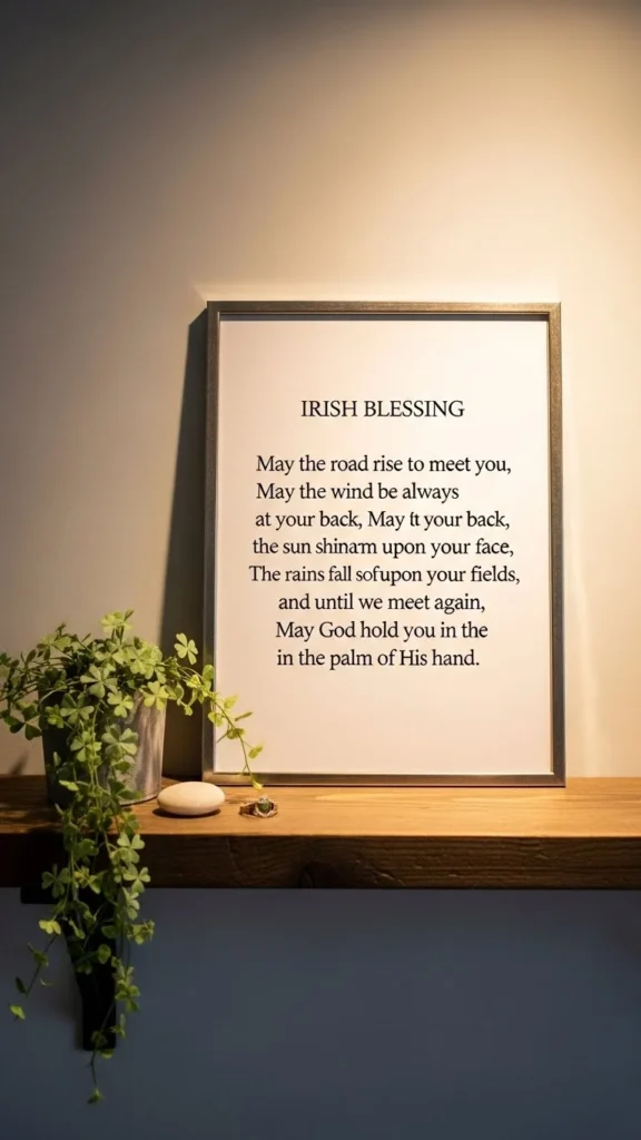 Words add meaning to decor when done simply. An Irish quote or blessing feels thoughtful and personal. Choose clean typography and neutral backgrounds. Green accents should be subtle. Frames matter more than the print itself. Wood or thin metal frames keep things grounded. Print the quote at home to save money. Place it where people pause, like hallways or reading corners. Avoid oversized text that dominates the wall. This type of decor feels timeless and works beyond the holiday.