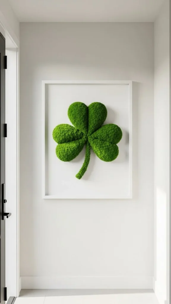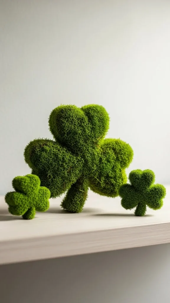 Moss adds texture and color naturally. One shamrock is enough. Mount it in a frame or on wood. Dollar Tree moss sheets work well. Symbolic decor kept simple avoids clutter.