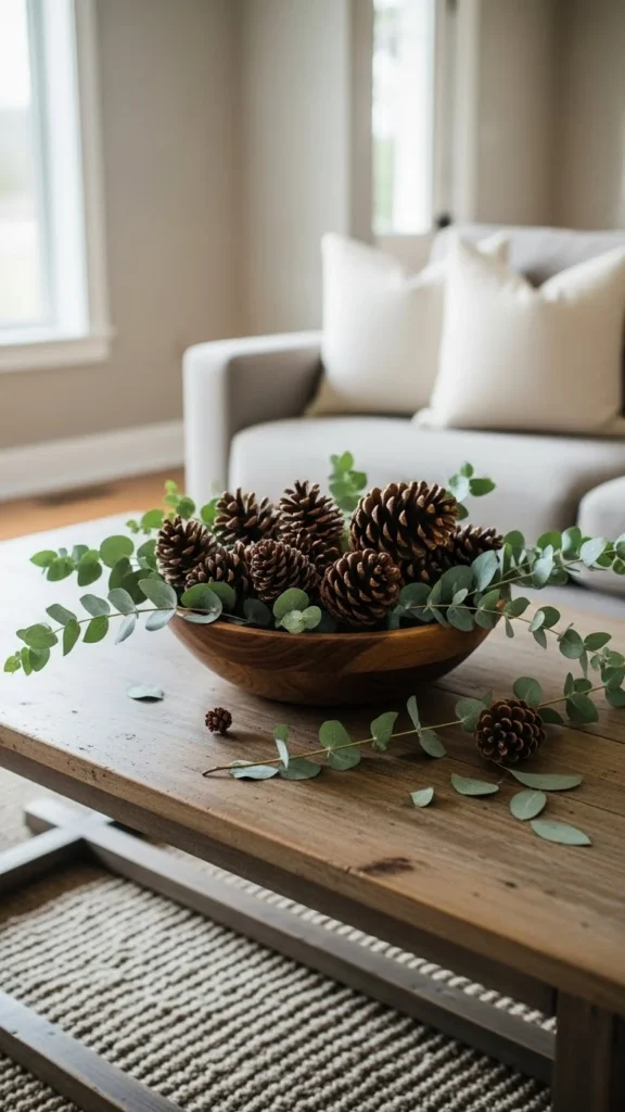 Pinecones add texture without holiday symbols. Mix with greenery. Keep bowl low. Works well for coffee tables. Nature-based styling blends easily with everyday decor.