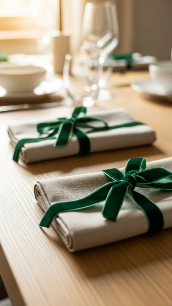 Napkin ties are easy and reusable. Velvet or cotton ribbon works well. Avoid stiff bows. Loose knots feel relaxed. Small details repeated lightly bring cohesion.