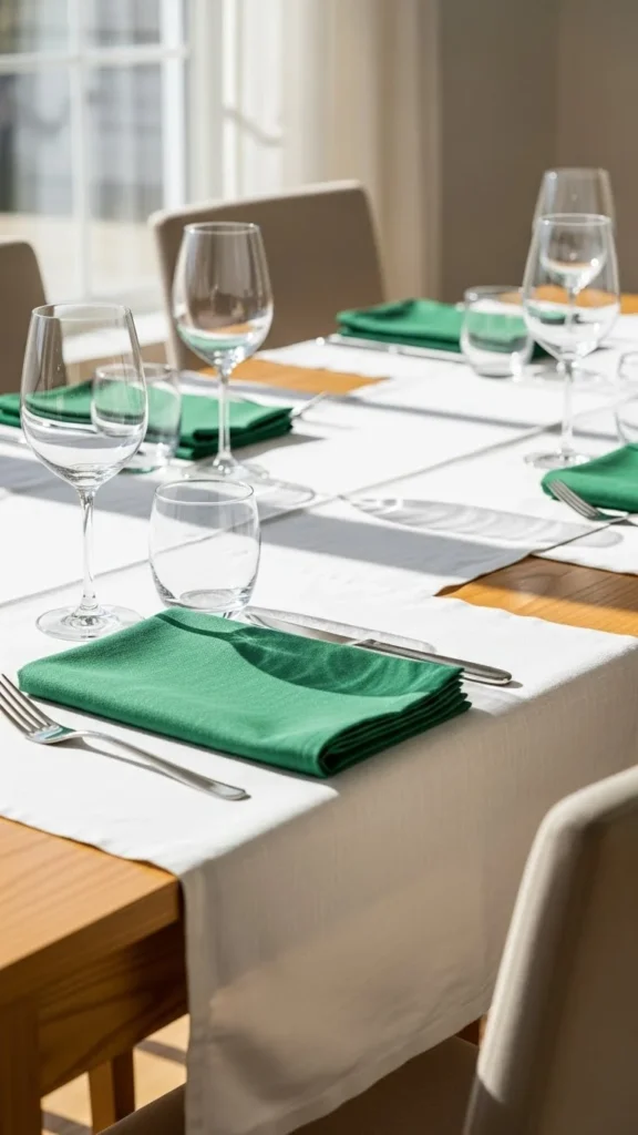 A good tablecloth sets the base. White linen feels timeless. Add green through napkins or runners. This nods to heritage quietly. Foundation pieces matter more than themed decor.