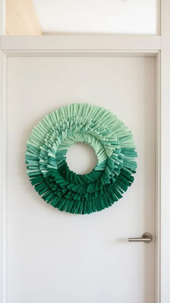Felt fringe adds texture without weight. Use three green shades only. Arrange from light to dark for gentle flow. Keep the wreath thin, not bulky. Felt cuts cleanly and doesn’t shed. This style photographs well for Pinterest and works indoors or out. Texture-led decor feels intentional when colors stay limited. Hang it alone without extra accents for best effect.