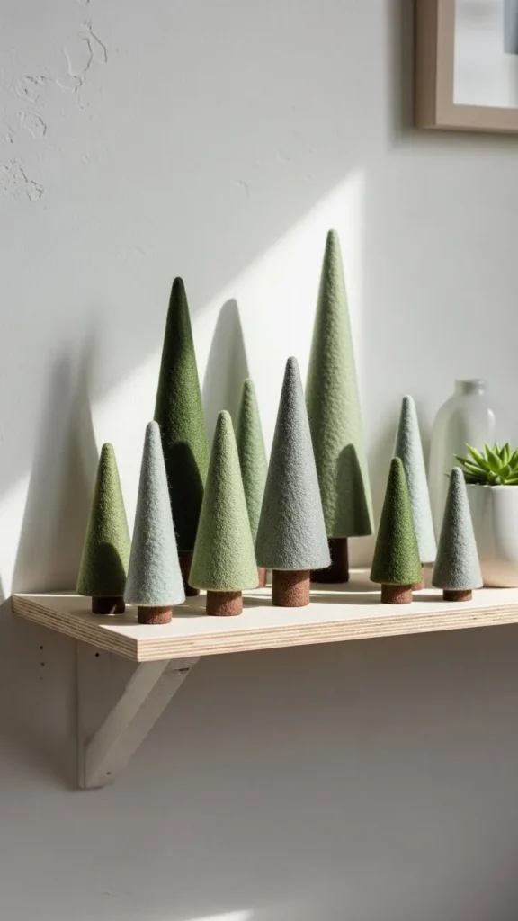 Mini trees add charm without visual noise. Felt keeps it soft, not shiny. Stick to two or three pieces. Vary heights slightly. Neutral shelves help them stand out. These store flat after the season. Space-saving decor works well for shelves and desks.