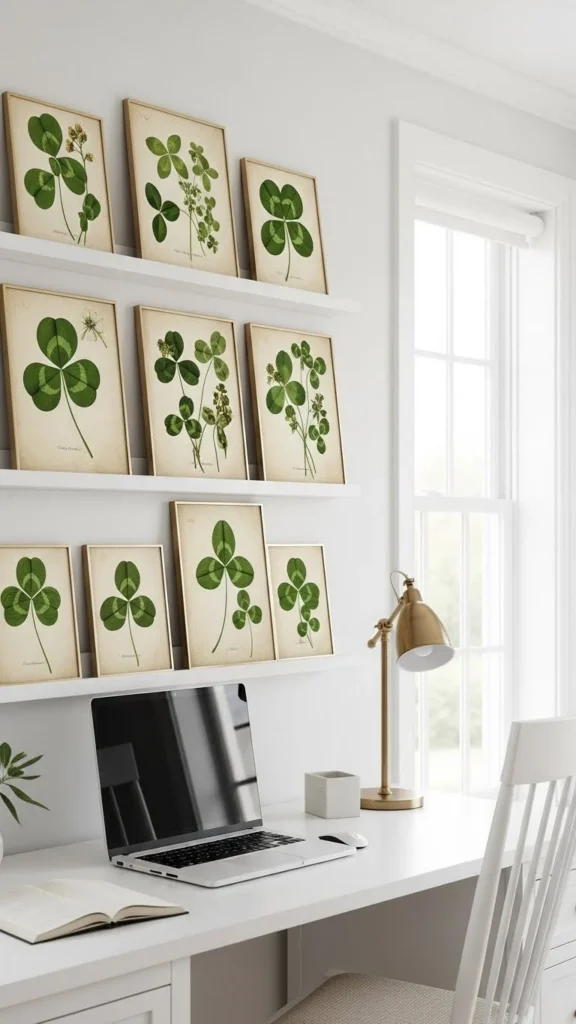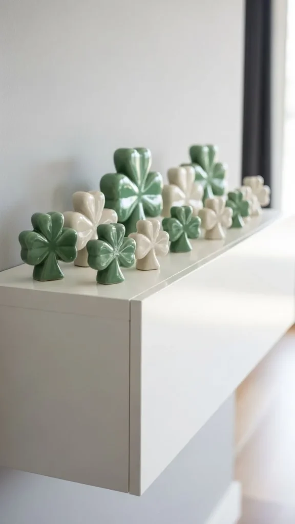 Mini ceramic clovers bring quiet St Patrick’s Day charm without shouting holiday decor. Their smooth finish keeps the look clean and polished. Stick to two or three pieces to avoid clutter. Odd numbers read better on shelves. Pair them with neutral books or a small framed print to balance the green. If ceramic feels pricey, air-dry clay painted with gloss varnish works well. Use varying heights by stacking one on a small book. Keep surrounding items matte so the shine stands out. This style fits living rooms, offices, or bedrooms. Soft daylight highlights the curves beautifully.