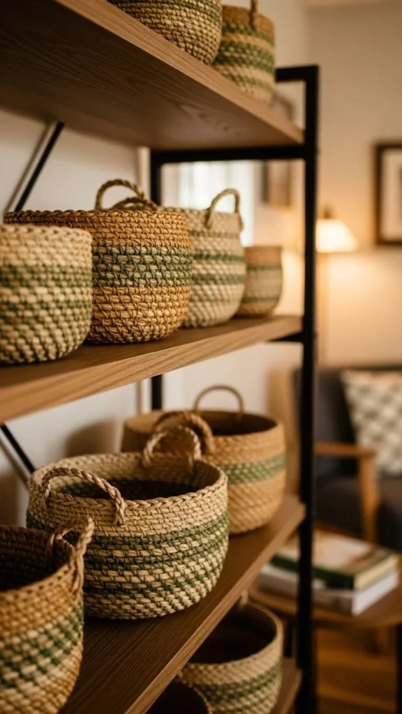 Baskets add warmth and hide clutter. Green accents keep the theme subtle. Use them for keys or candles. Thrifted baskets can be dyed lightly. Keep shapes simple. Great for family rooms.