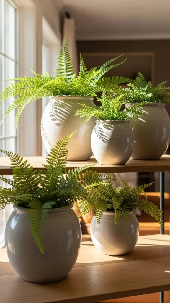Ferns read classic and calm. Faux versions avoid upkeep. Choose stoneware for texture. Keep foliage trimmed to shelf height. Pair with books for balance.