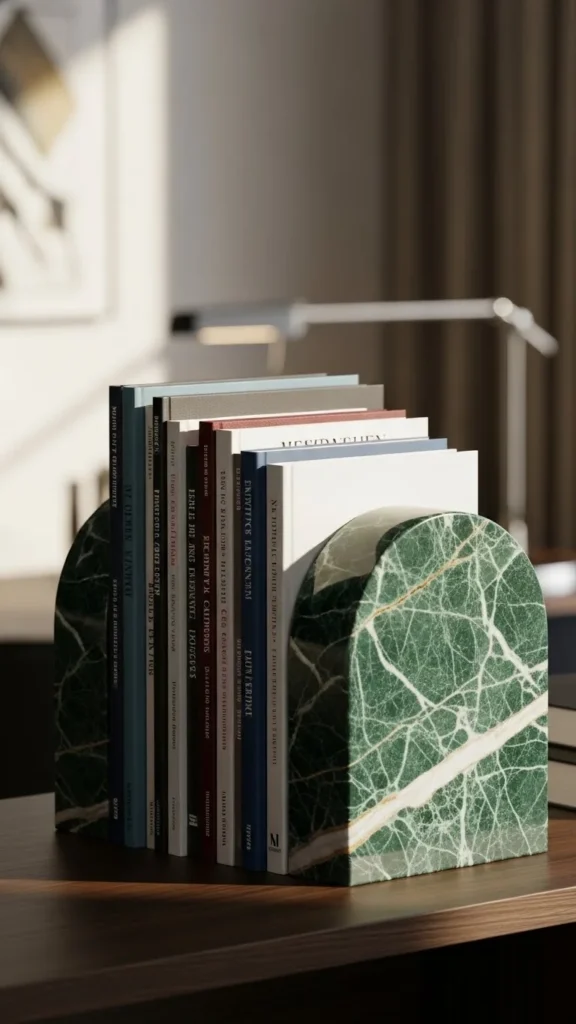 Marble adds weight and polish. Green veining ties into the theme. Resin look-alikes cost less. Place them at shelf ends for structure. Ideal for offices.