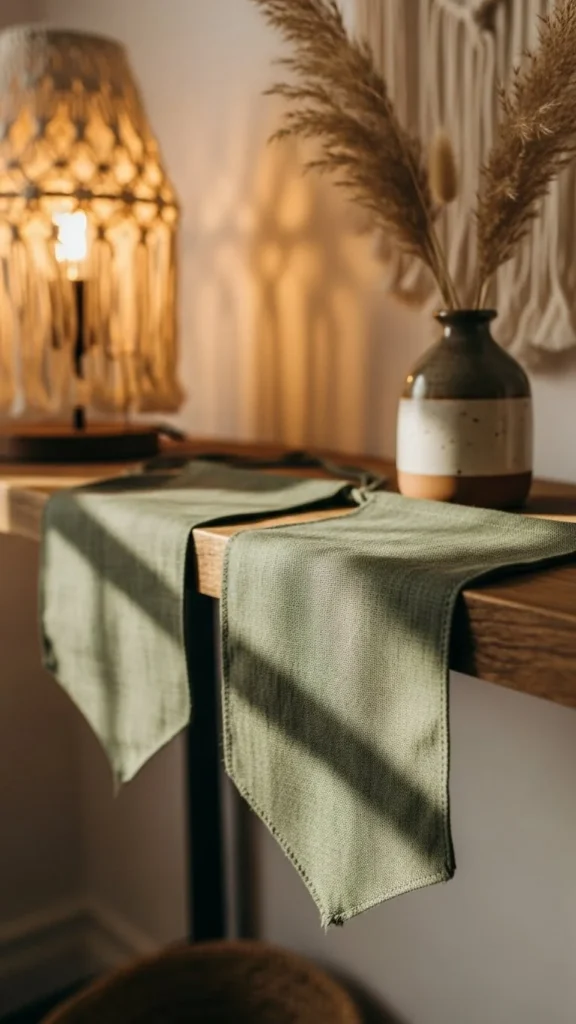 Fabric breaks up hard lines. Keep banners short and simple. Linen scraps work well. Drape loosely for ease. Pair with wood and ceramics.