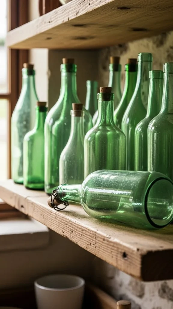 Old bottles feel collected over time. Mix shapes for interest. Leave them empty or add single stems. Thrift stores are great sources. This style suits kitchens.