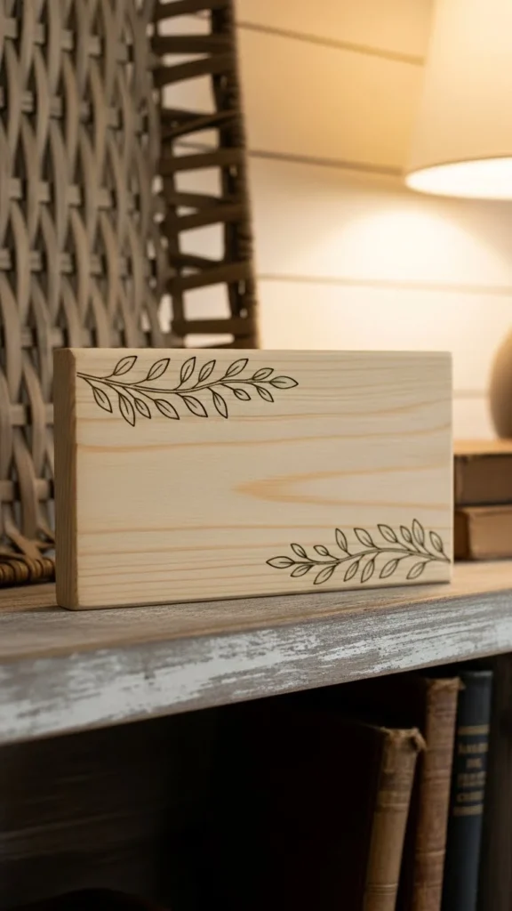 Motifs hint at the holiday quietly. Keep graphics simple. DIY signs save money. Lean them against books for layering.