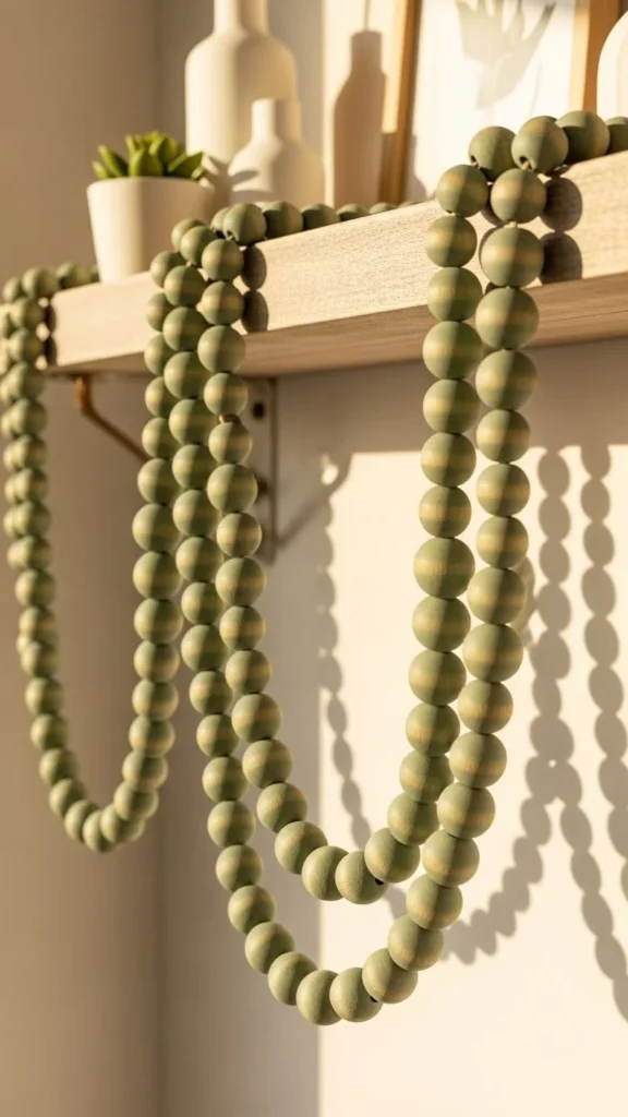 Garlands add movement. Use muted paint for a calm look. Make your own with craft beads. Drape loosely for ease. Works well on long shelves.