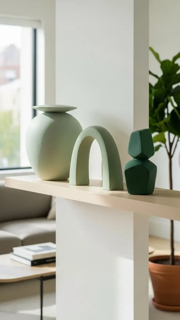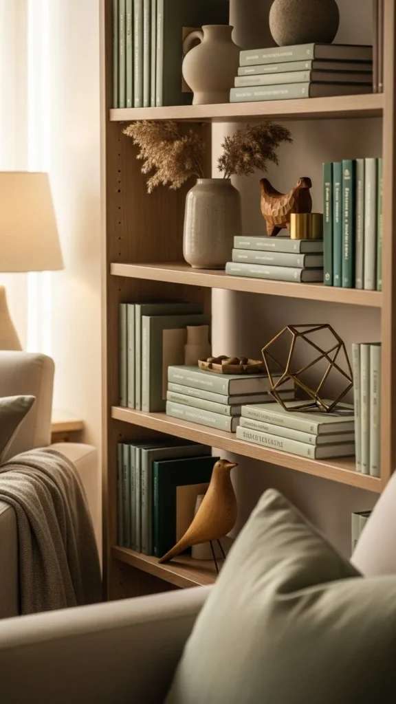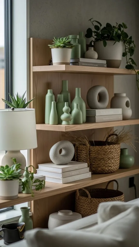 Layering creates visual flow. Alternate green items with neutrals. Vary height and texture. Step back and adjust spacing. This method works on any shelf size. Keep it relaxed and intentional.
