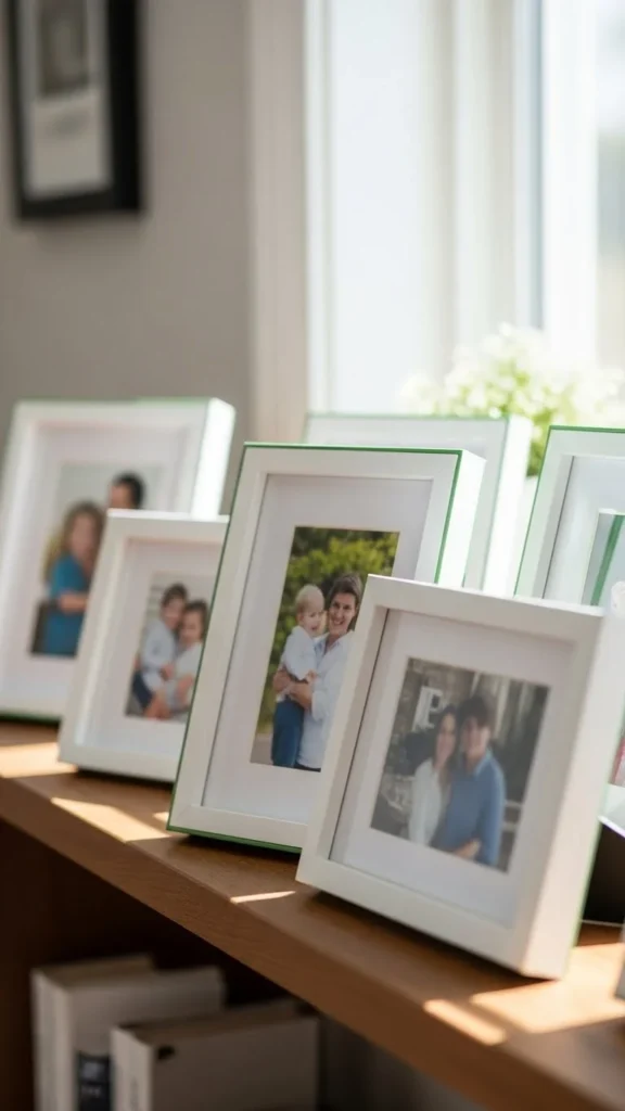 Frames personalize shelves. Thin green edges keep it subtle. Paint existing frames to save money. Mix horizontal and vertical orientations.