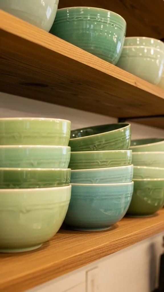 Glazed ceramics add color through texture. Stack in small groups. Handmade pieces feel special. Use them daily or display them.