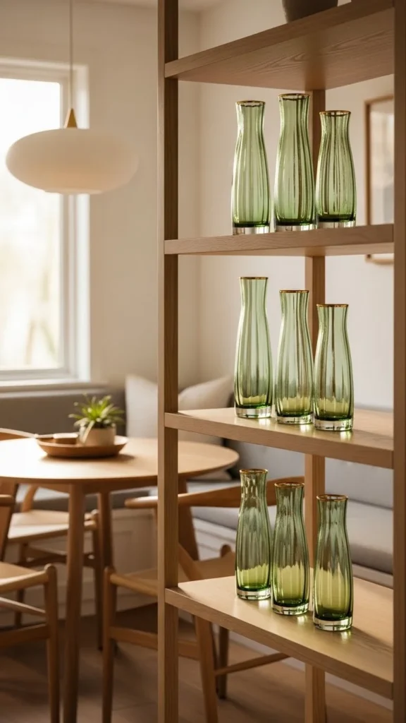 Green glass with gold trim adds subtle glamour to shelf decor. The metallic edge catches light without overpowering the space. Use dried stems, eucalyptus, or leave them empty. Empty vases still read intentional. Thrift stores often carry similar glass pieces at low cost. Group them in a staggered line rather than a tight cluster. Keep the shelf background neutral for contrast. This look works well in dining areas or kitchens. Warm bulbs enhance the gold detail at night.