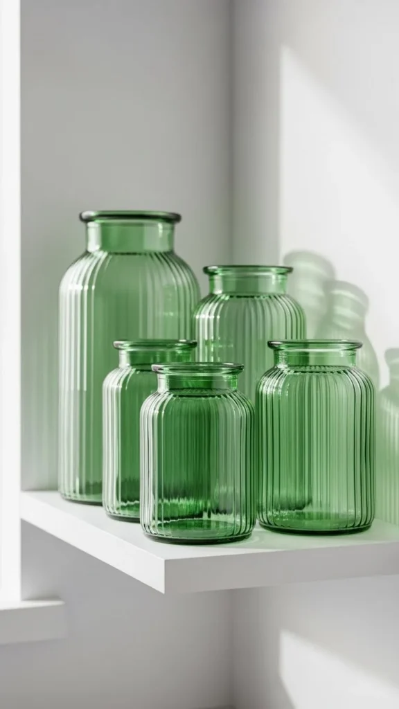 Ribbed glass adds visual rhythm without overpowering a shelf. The texture catches light and creates soft shadows. Use jars with or without lids. Both work well. Leave them empty for a cleaner look or add matchsticks, beads, or dried stems. Thrift stores often carry similar jars at low cost. Keep spacing loose so the ribbing stands out. Pair them with flat objects like books or trays to avoid too much texture in one spot. This style fits kitchens, dining rooms, or open shelving.