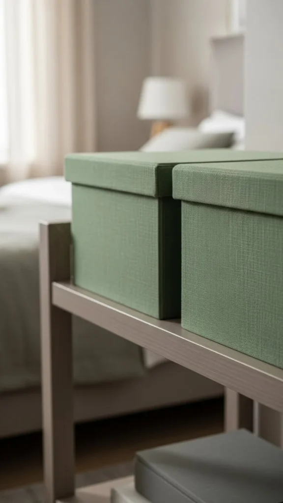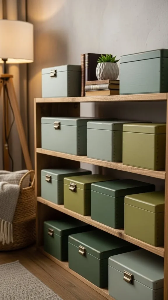 Wooden boxes bring structure and quiet color. Muted green keeps things calm. Use them to hide small clutter like remotes or notes. DIY tip: paint unfinished boxes with chalk paint for a soft finish. Light sanding adds character. Stack one box on a book to create height. Keep labels off for a cleaner look. This idea works well on deeper shelves where items tend to disappear visually.