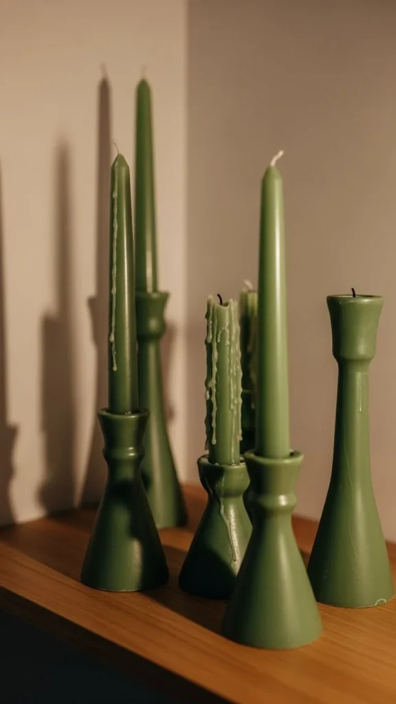 Candlesticks add rhythm to shelf styling. Mixed heights prevent a flat look. Stick to matte finishes for a softer feel. Use cream candles for contrast. Thrifted brass holders painted green are a budget fix. Keep spacing even so the shelf feels calm. Great for living rooms or dining spaces.