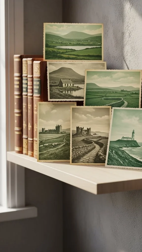 Postcards tell a story without crowding shelves. Choose designs with maps or landscapes. Tuck them into frames or lean them casually. Printable replicas work well if originals cost too much. Pair with travel books for context. This idea suits personal spaces.