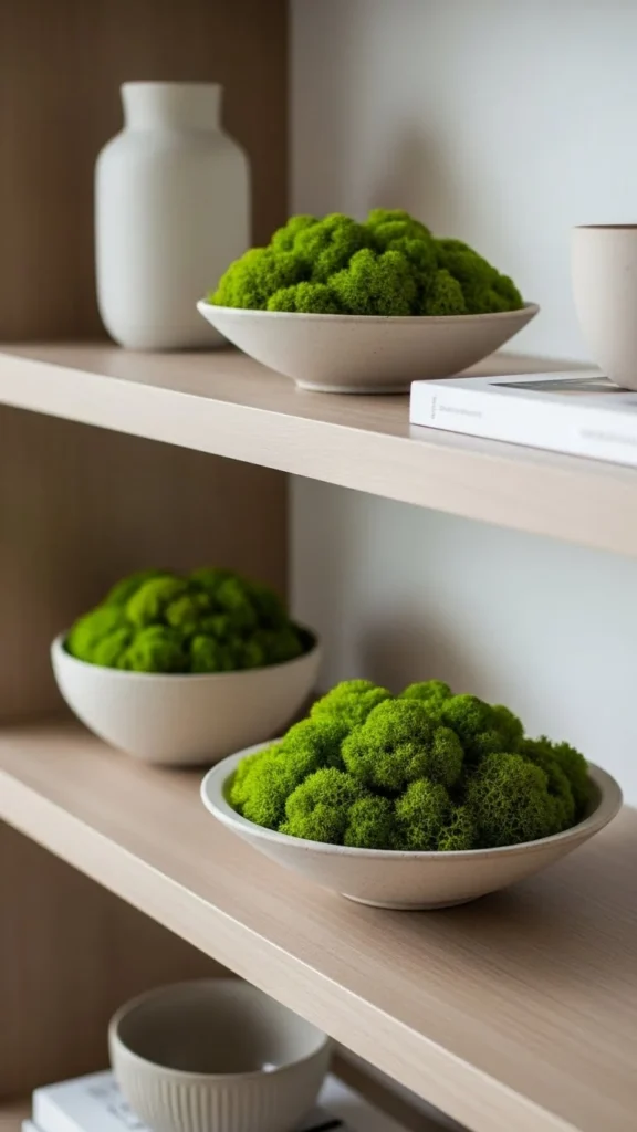 Preserved moss brings natural texture indoors. It stays tidy and requires no care. Choose shallow bowls to keep it light visually. Faux moss works just as well. Balance it with smooth objects nearby. Ideal for modern or rustic shelves.