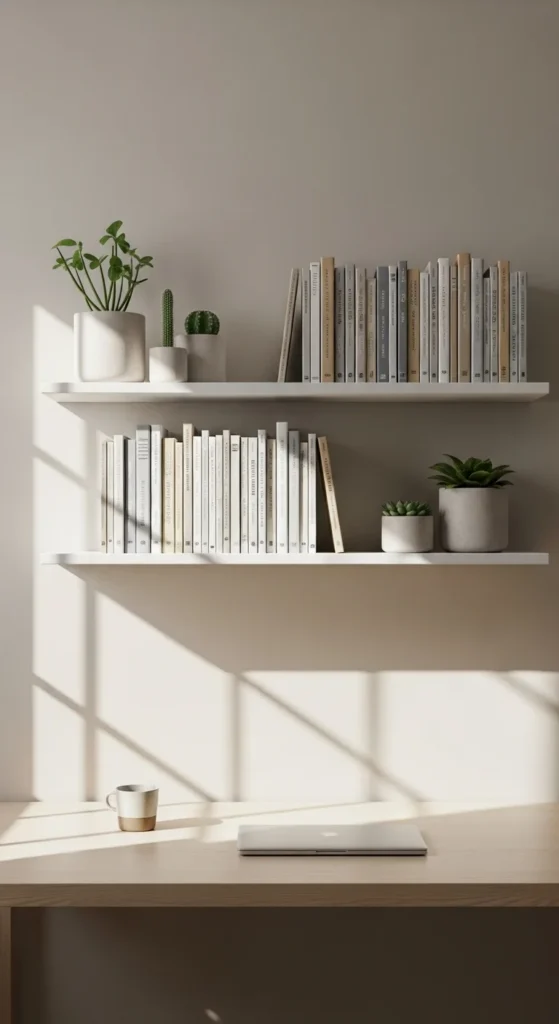Floating wall shelves help keep your workspace open and clutter-free. They let you store books and small decor pieces while still maintaining clean desk space. Choose shelves in colors that blend with your wall paint so the look stays smooth rather than overwhelming the room. Mix a couple of small framed prints with stacked books for balance. If you’re working with a small room, go for narrow shelves that don’t protrude too far into the walk path. For DIY, cut wooden boards to the length you want, sand them well, and use metal brackets or hidden mounting hardware. Add one tiny plant for life without crowding the visual space. The key is to keep only what you frequently reach for and remove everything else. This helps your study area feel calm and visually light.