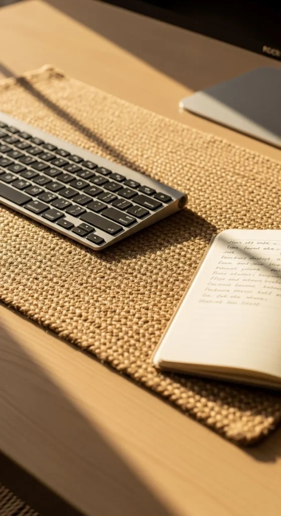 A desk mat defines your workspace and adds texture. Choose one made of jute, felt, or leather depending on the mood you want. Lighter tones help keep the look soft and calming. Desk mats also protect the surface from scratches. If you want a budget option, cut a piece of craft felt to size. This adds a smooth working zone while also grounding the look of your desk.