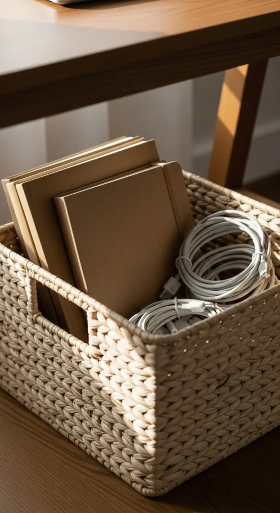 Under-desk storage bins help you keep your study materials nearby without cluttering your workspace. Choose one that fits comfortably beneath your desk without taking up leg space. Woven or fabric bins add texture and warmth, while clear plastic bins work well if you prefer to see what’s inside. Store things you don’t use constantly—extra notebooks, old assignments, or tech accessories. If you rotate subjects or semesters, you can swap items in and out seasonally. This method also encourages you to clean out old materials regularly. Keeping extra tools tucked away but easily accessible supports a clear and steady study environment.