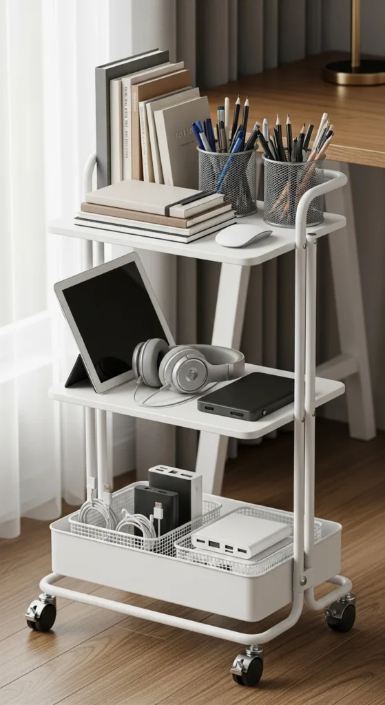 A rolling cart acts as extra storage that moves with you. Keep your study materials sorted by shelf—top for daily tools, middle for devices or chargers, bottom for reference books. You can roll the cart out when working and tuck it away when done. If your room doubles as other space, this is especially helpful. You can spray paint the cart or add labels for a custom look. This system helps maintain smooth study transitions.