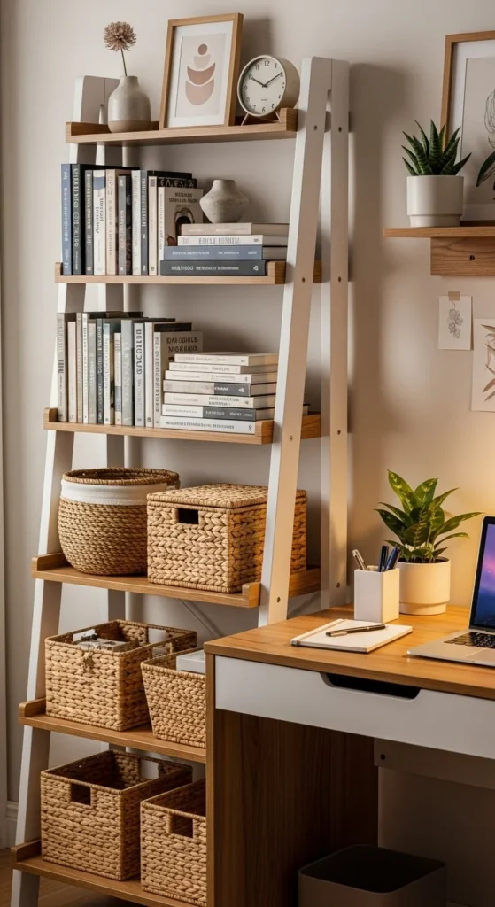 A ladder shelf adds vertical storage while keeping the room visually open. This shape draws the eye upward, making small rooms feel taller. Use lower shelves for heavier items and upper shelves for lighter decorative touches. You can place baskets on the bottom shelves to hide smaller items. It’s practical and stylish at the same time, supporting a balanced study space.