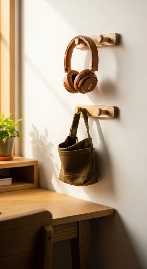 Wall hooks help keep daily-use items off the desk and chair. Hang your headphones, tote bag, or sweater to prevent clutter. Wood hooks add warmth; metal hooks look clean and modern. Mount them at a comfortable height for regular use. This creates a practical grab-and-go system.