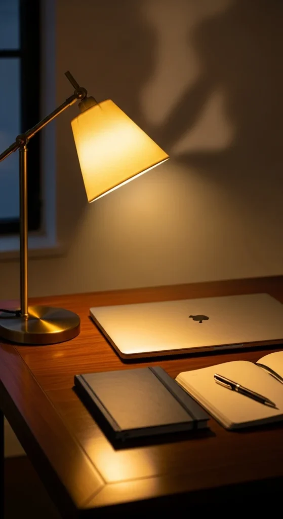 Lighting has a strong effect on focus and energy. A warm desk lamp can help maintain a calm environment while preventing eye strain. Look for lamps with adjustable arms so you can direct the light exactly where you’re working. Warm bulbs create a gentle atmosphere that is easier to stay in for long study sessions. If your desk is close to natural daylight, complement it with soft evening lighting. For a DIY detail, swap in warm LED bulbs or install a dimmer switch so you can control brightness. Use the lamp to highlight one study zone on your desk to keep it visually defined. Good lighting encourages comfortable concentration and helps build a regular study rhythm.