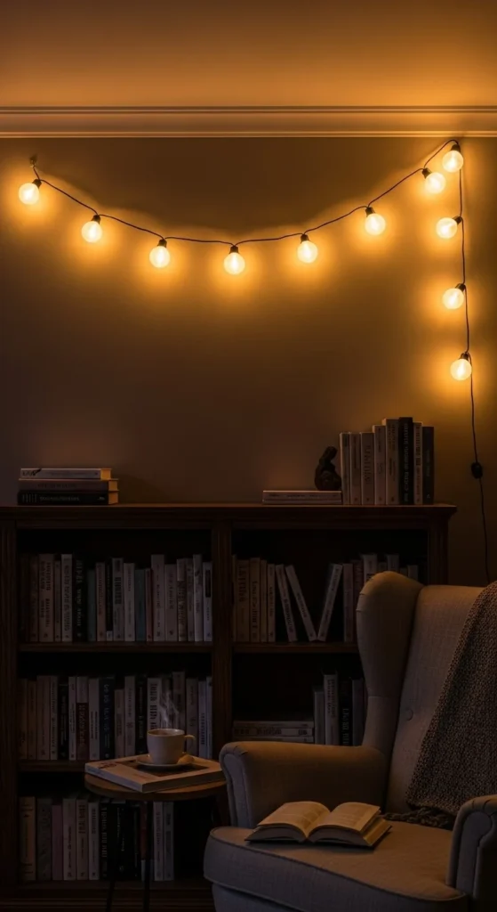 String lights add a soft ambiance that helps ease into study mode during evenings. Choose warm white tones rather than bright or colorful lights. Hang them in a single clean line rather than looping them heavily. This keeps the look calm rather than festive. The lighting helps create a soothing atmosphere that supports focused time.
