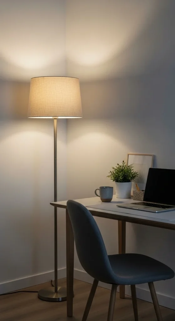 A floor lamp helps add balanced lighting to your study room. Place it behind or beside your desk to soften shadows without glaring directly at your screen. Choose shades that diffuse light gently. Slim lamps take up little space and work well in corners. If you prefer a modern look, choose black or metallic finishes; if you want softness, choose wood or linen. A calm lighting setup helps you stay settled during long study sessions and supports a peaceful atmosphere.