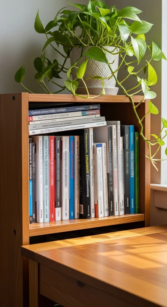 Keeping study materials close prevents interruptions. A small bookshelf placed within arm’s reach allows you to access textbooks quickly. Arrange items by height or subject for easy browsing. Use a decorative storage box on the bottom shelf for loose items. A single plant or photo frame on the top shelf keeps the look balanced. This setup helps you remain organized and steady while working.