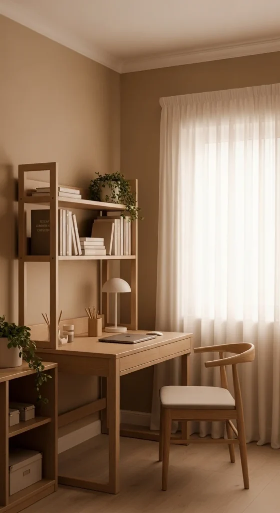 Neutral tones help create a calm environment. Beige, white, taupe, sand, and sage work together to make the space feel restful. These colors prevent visual overwhelm and keep the focus on your work rather than the surroundings. If your walls are already bright or patterned, tone the room down with neutral decor items—desk accessories, curtains, or storage elements. The palette supports clarity and reduces distraction.