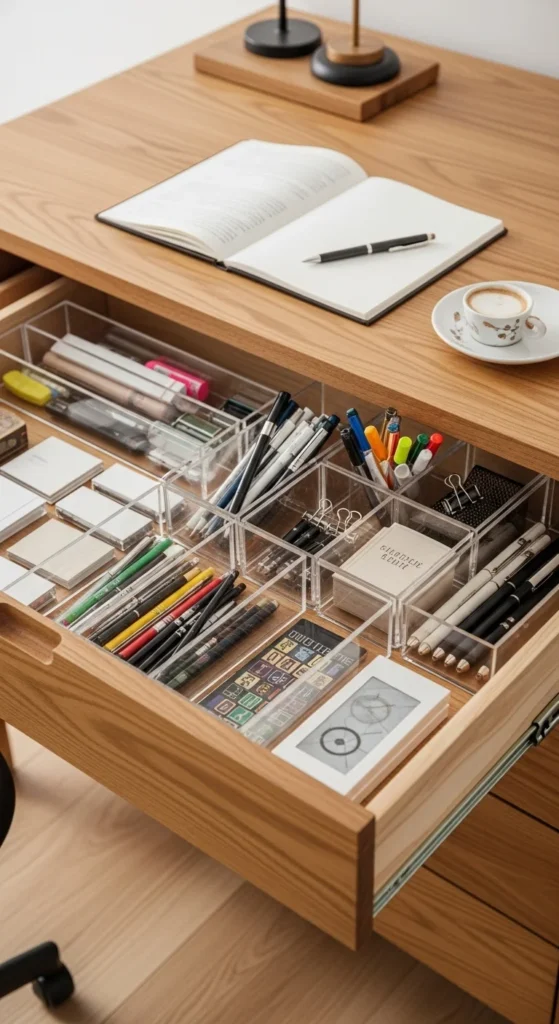 Drawer organizers stop clutter from building up on your desk. Use trays, boxes, or cutlery organizers to group similar items. Keep frequently used tools in the front section. Larger items can go toward the back. This makes cleaning up faster at the end of study sessions. You can repurpose small containers you already have instead of buying new storage. When everything has a place, your desk feels easier to use and maintain.