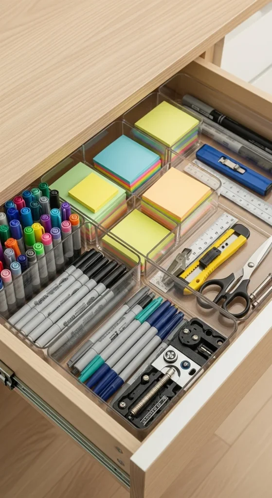 A designated stationery drawer helps keep your desktop clear. Group similar items using small dividers or repurposed gift boxes. Keep only your daily-use tools in this drawer to avoid overcrowding. Clearing away visual distractions supports calm concentration. When items are easy to find, transitioning between tasks becomes smoother.