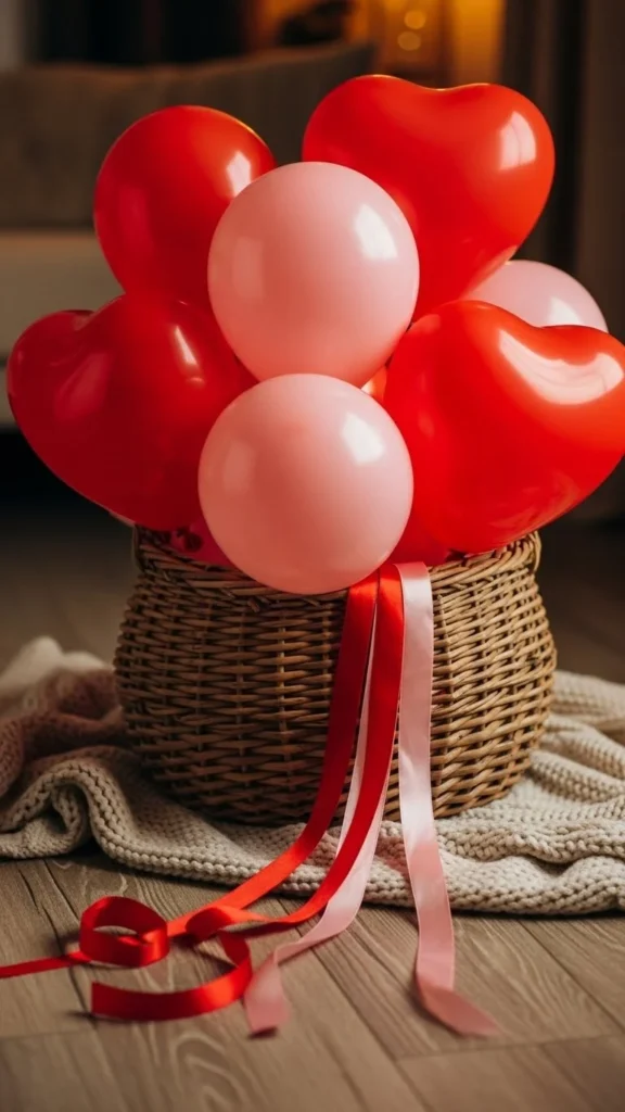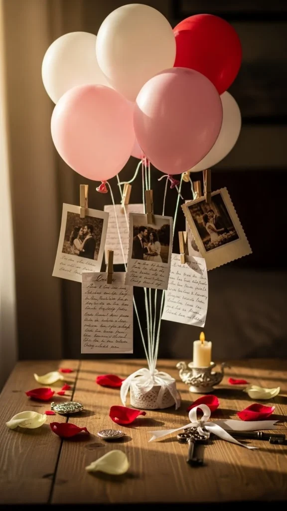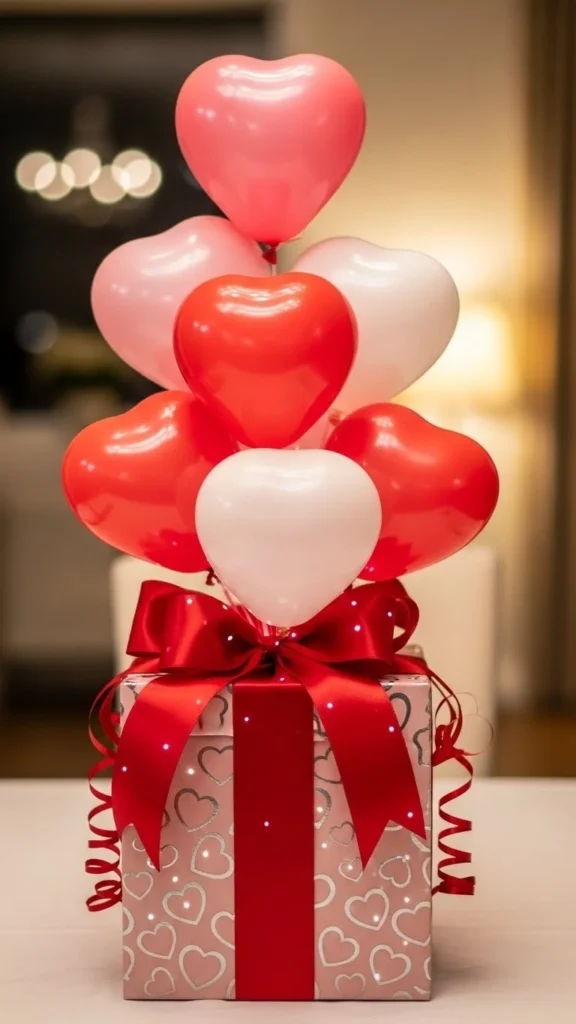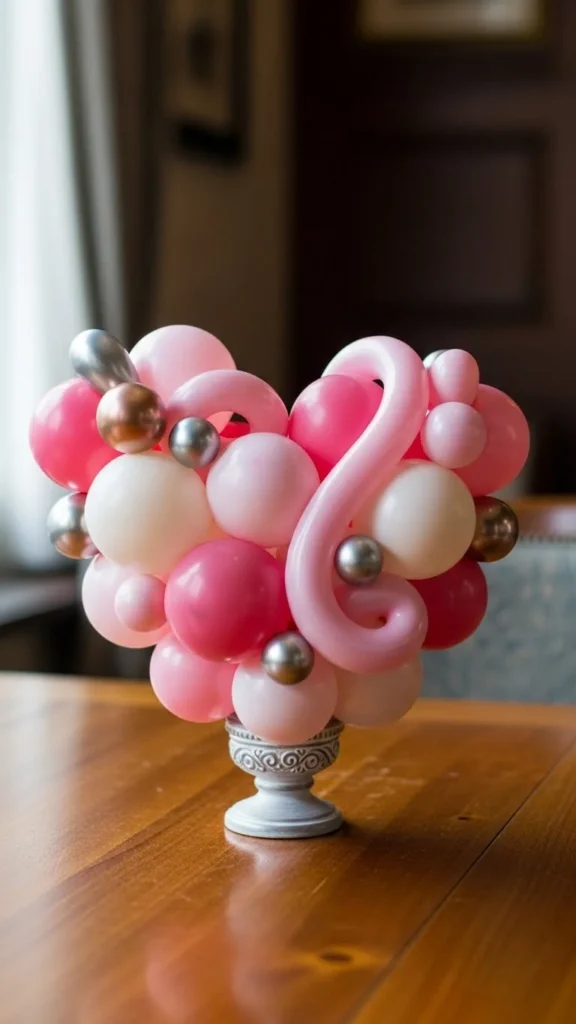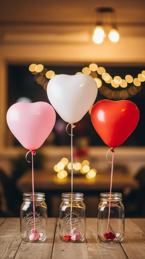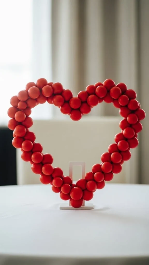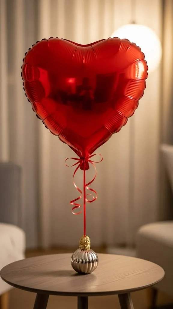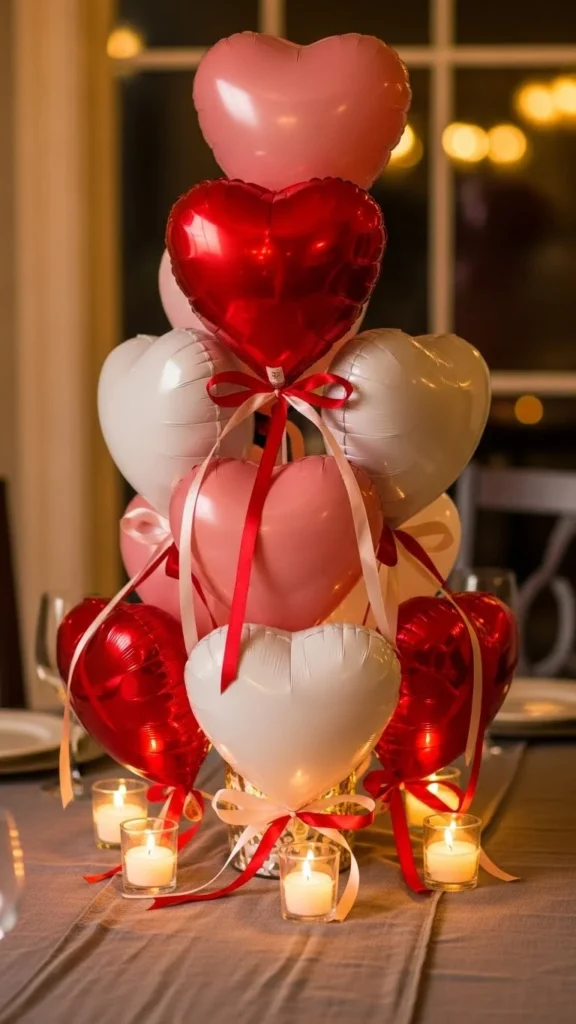 This heart cluster works when you want instant celebration without covering the whole table. Use balloons in three close tones to keep the look calm and romantic. Anchor them with a small hidden weight or a decorative box wrapped in paper. Satin ribbon tied loosely adds movement and softness. Keep the cluster low so guests can see each other across the table. For a budget option, mix foil hearts with standard latex balloons. Use fewer foil pieces and more latex to control cost. Place candles or fairy lights around the base for glow without clutter. This style fits dining tables, coffee tables, or buffet setups. It pairs well with simple plates and solid-color napkins. Soft color layering makes the arrangement feel intentional rather than busy. If space is tight, use five balloons only and group them tightly. Small details do the work here.