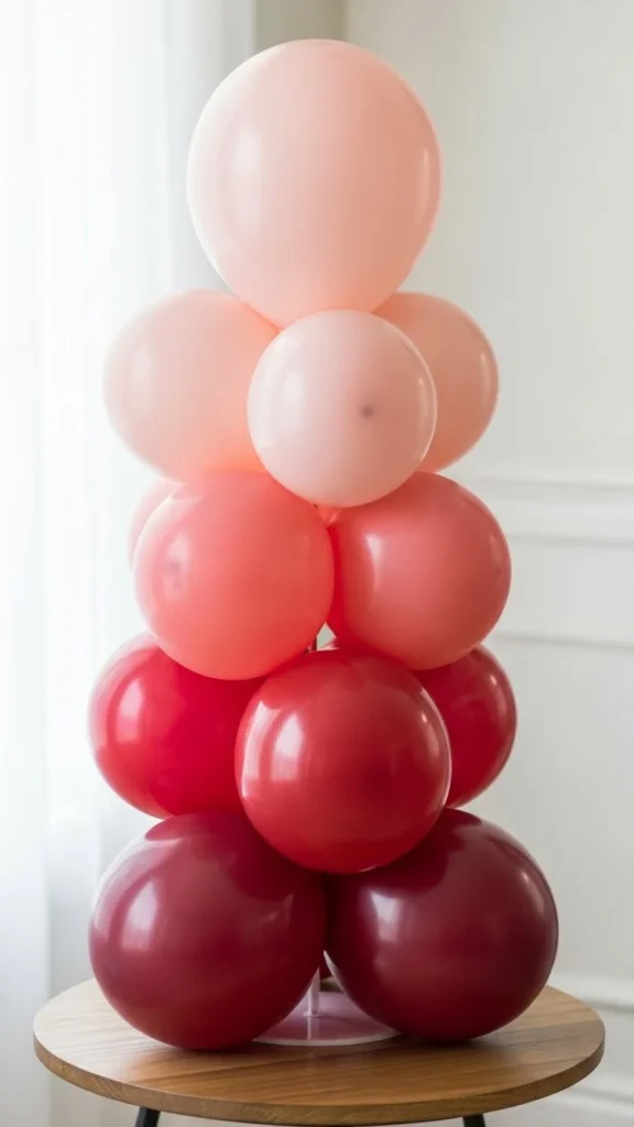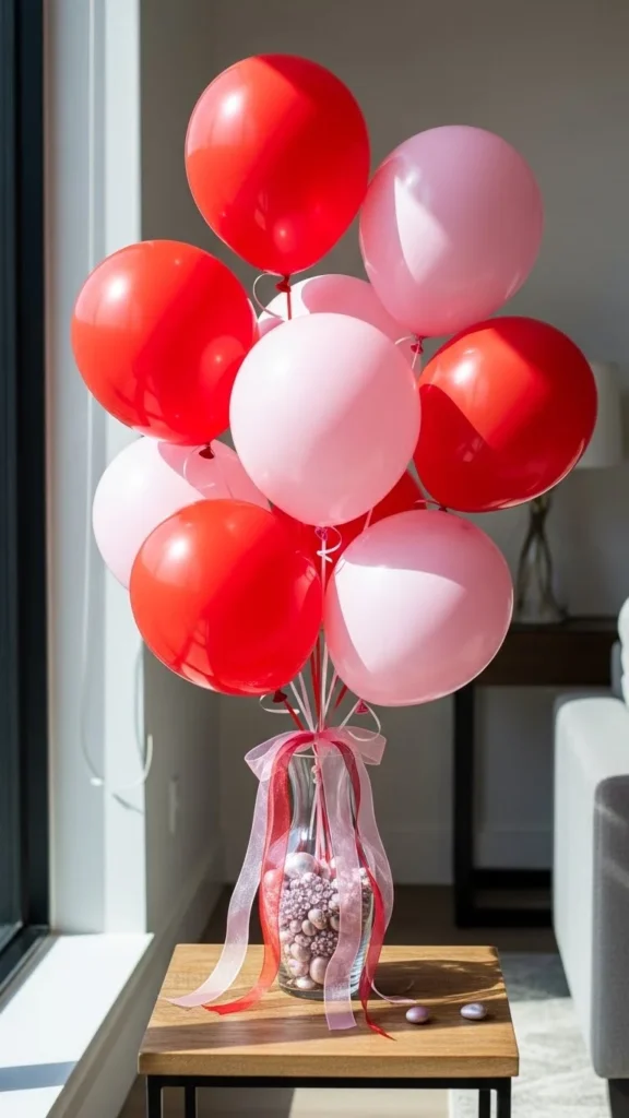 A glass vase turns balloons into a centerpiece that feels light and clean. Choose clear or lightly tinted glass so the ribbons remain visible. Fill the vase with stones or marbles to hold everything steady. Keep balloon sizes consistent for a tidy look. This idea works well for small tables or entry consoles. If you want a softer feel, use blush and cream balloons instead of bold red. Curl the ribbon ends slightly for movement. For DIY control, inflate balloons just enough to stay round without stretching. This helps them last longer. Budget-friendly tip: reuse vases you already have and change only balloon colors for each event. The transparency keeps the table from feeling crowded. Simple shapes with clear bases create balance. This setup also photographs well from above, making it great for party photos.