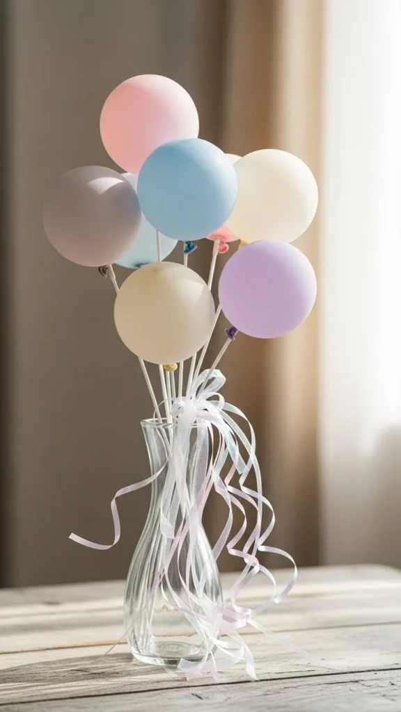 Mini balloons in a bowl feel casual and fun. Use air-filled balloons only. This suits relaxed gatherings. Low-profile decor keeps tables usable.