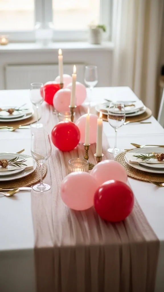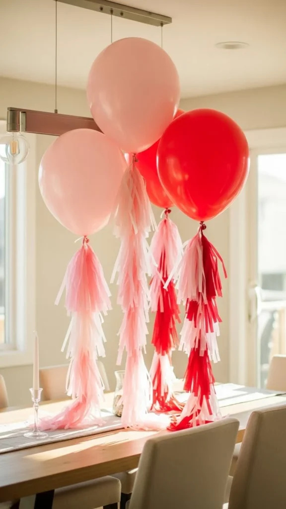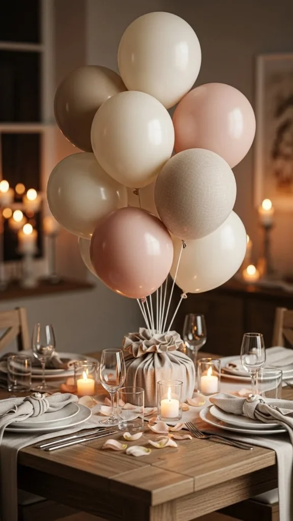 A floating trio adds height without heavy decoration. Stick to three balloons to keep the look controlled. Tassel garlands bring texture and gentle movement. Choose tissue or yarn depending on your style. Keep tassels long so they frame the table visually. This works best for rectangular tables where vertical space matters. If helium is not an option, attach balloons to thin wooden sticks hidden inside decorative jars. Use neutral table decor so the balloons stay central. For a lower-cost version, skip tassels and tie a wide ribbon instead. This idea fits casual dinners and small gatherings alike. Vertical lines draw the eye upward and make the table feel styled. Keep balloon colors soft if the room already has strong accents.