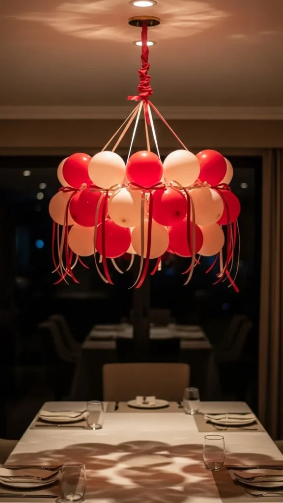 A mini balloon chandelier brings drama without blocking conversation. Keep it low-profile by using smaller balloons and a slim hoop. Tie balloons evenly so the shape stays balanced. Hang it just high enough to clear eye level when seated. Choose matte finishes to avoid glare under lights. If ceilings are low, shorten ribbons and reduce layers. For a DIY shortcut, use a floral hoop and fishing line. Add a few ribbon tails for motion. This works best over round tables where symmetry matters. Pair with simple place settings so the overhead detail stands out. Balanced spacing keeps the look calm. For budget control, mix a few foil accents with mostly latex. Test the height before guests arrive and adjust once the table is set.