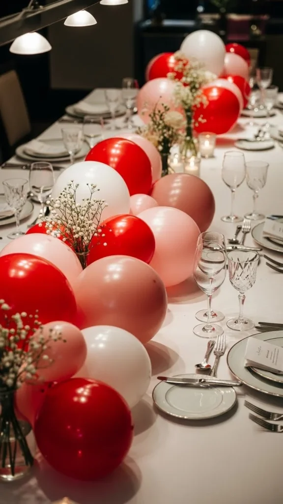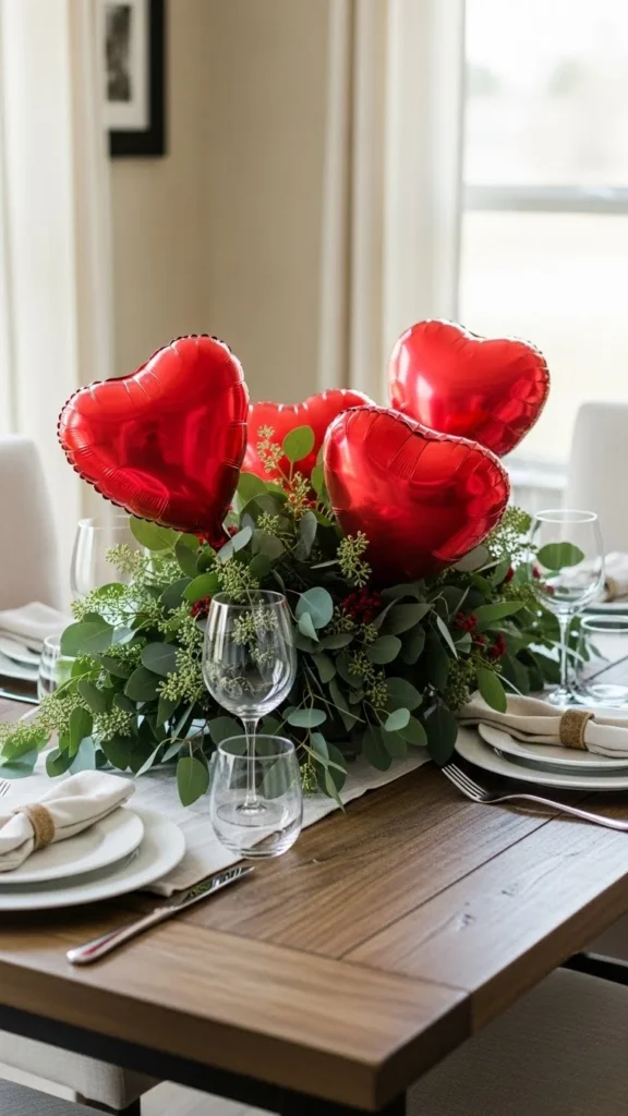 This centerpiece blends playful balloons with calming greenery. Keep balloons air-filled and small so leaves remain visible. Use faux greenery to avoid water near latex. Arrange greens first, then tuck balloons in clusters. This style works for long tables and brunch settings. Choose muted reds for a softer feel. Scatter a few loose leaves along the runner for flow. Natural texture grounds bright color and keeps things relaxed. For savings, reuse greenery for other events by swapping balloon colors. Keep the height low to preserve table space. If you want extra shine, add a few ribbon bows tied onto stems.
