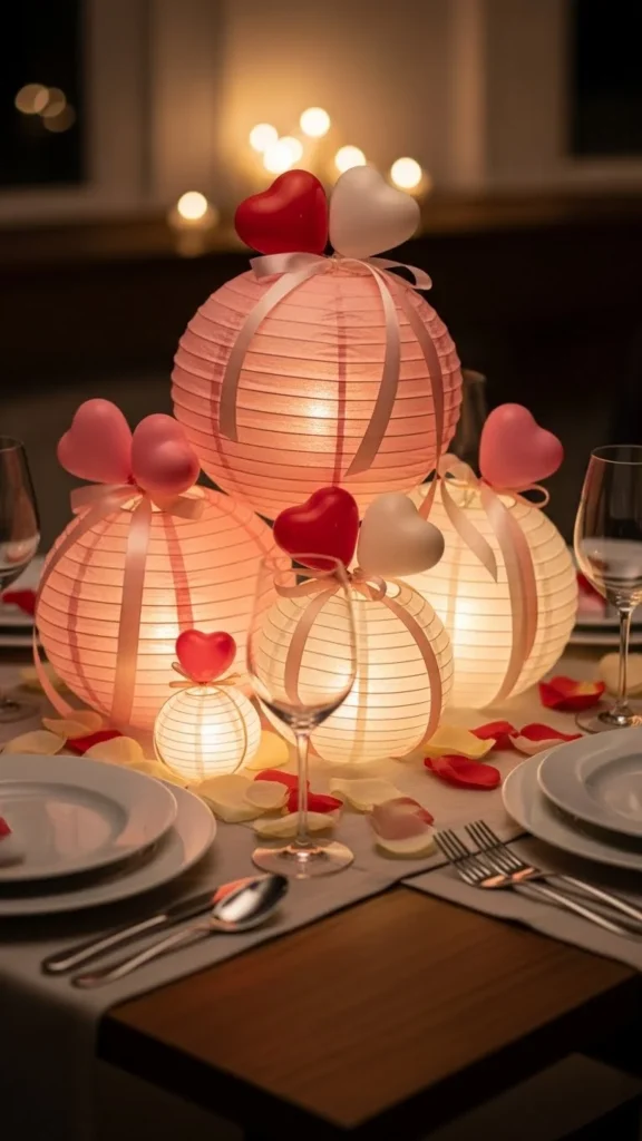 Lanterns add structure while balloons add fun. Choose lightweight lanterns so balloons can attach easily. Secure balloons with removable adhesive dots. Place LED candles inside for glow. This idea suits evening dinners and cozy rooms. Keep colors light to avoid visual heaviness. Soft glow adds warmth without clutter. For a quick DIY, wrap ribbon around the lantern top and tie balloons there. Space lanterns evenly for rhythm across the table.