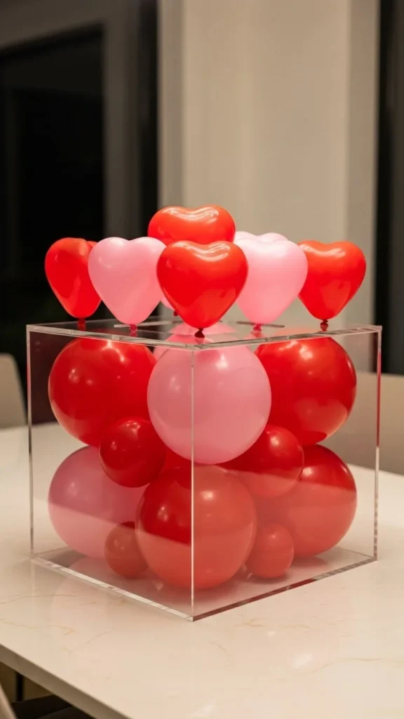 Balloon boxes feel structured and neat. Use clear boxes to show layers inside. Keep balloon sizes mixed for depth. This centerpiece works well for modern spaces. Add a ribbon around the box for softness. Budget option: use a clear storage box instead. Clean shapes keep things polished even with bright colors.