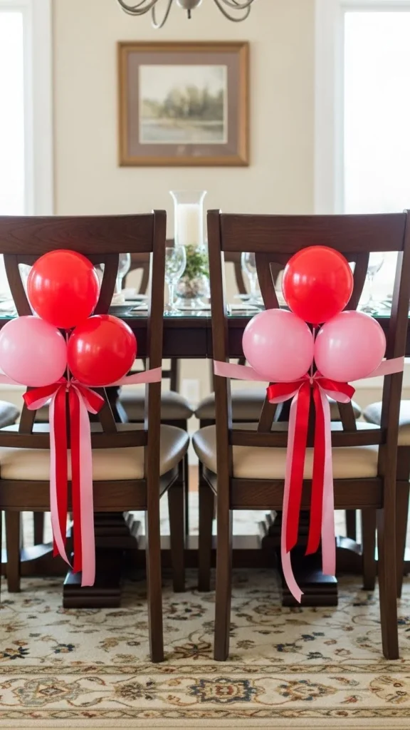 Tie small balloons to chair backs for subtle decor. Keep balloons small to avoid crowding. Satin or curling ribbon adds movement. This works well for dining tables or kids’ parties. Chair accents spread color evenly across the room without extra furniture.