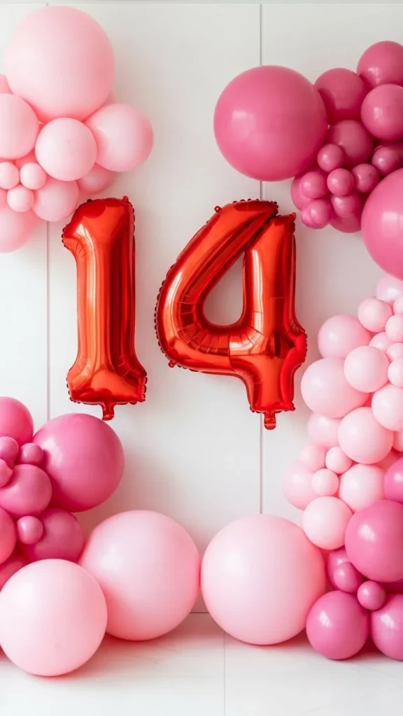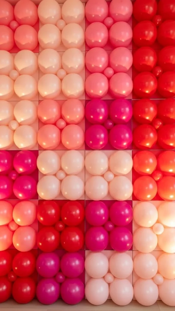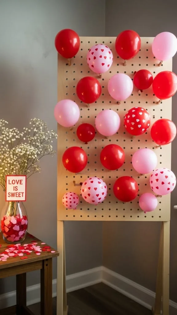 A balloon message pegboard mixes decor with interaction. Use a pegboard or wire grid as the base. Clip small balloons alongside handwritten notes or cards. Keep balloon sizes small so messages remain readable. Red and blush work well against neutral boards. This setup fits nicely near entrances or gift tables. Guests can pin notes, jokes, or sweet lines throughout the party. For a budget version, swap the pegboard for a string grid made with twine. Mini clothespins hold balloons just as well. Interactive decor keeps guests engaged without games or props. Change messages during the event to refresh the look. Soft side lighting helps balloons cast gentle shadows, adding depth to photos.